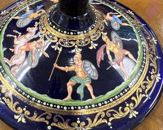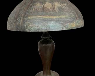 Glass shade reverse painted with a detailed forest scene on a bronze base — both shade and base signed Handel.